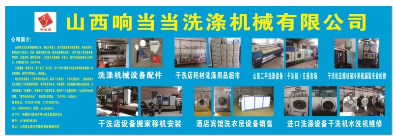 山西响当当洗涤机械有限公司是一家集维修、销售、安装调试于一体的高新技术企业。专业生产洗涤设备。主要产品有四氯乙烯干洗机、石油环保干洗机、水洗机、洗脱烘多用机、烘干机、脱水机、烫平机等系列产品,它不仅满足了开办个体干洗店的需求,而且是各大宾馆、机关、部队、医院及洗涤厂的首先产品。